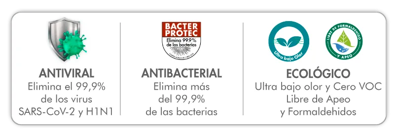 Elimina el 99.9% de los virus SARS CoV-2, H1N1 y las bacterias, efectividad certificada. Alta lavabilidad y cubrimiento. Pintura Ecológica.