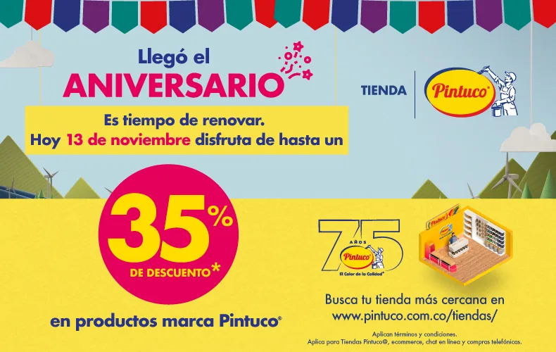 Este reglamento (TyC) delimita las condiciones bajo las cuales se regirá la actividad promocional denominada “ANIVERSARIO TIENDAS PINTUCO”, en adelante la Actividadla cual consiste en brindar a los consumidores, Descuentos de hasta un 35%* referencias seleccionadas.