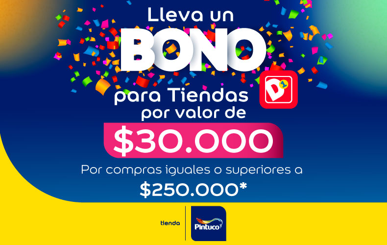 Tendremos disponibles once mil bonos de la Tiendas D1 por valor de 30.000 disponibles a nivel nacional en todas nuestras Tiendas Pintuco® y grandes superficies Homecenter e Easy que comercializan el portafolio de Pintuco®.